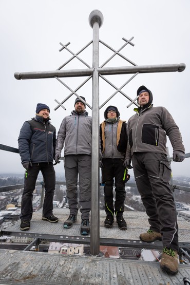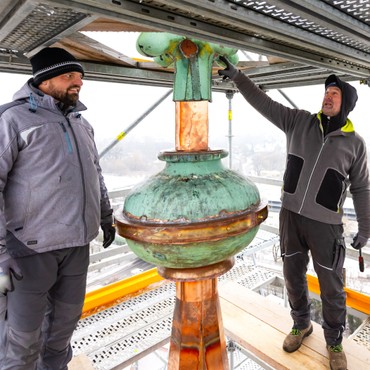 Turmkugel und Kreuzblume wurden von den Arbeitern auf der Turmspitze montiert.